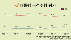 [뉴스포스트=강은지 기자] 여론조사업체 리얼미터가 지난 11월 28일부터 12월 2일까지(12월 1주차) 전국 만 18세 이상 남녀 2507명을 대상으로 윤 대통령 국정 수행 평가에 대해 조사한 결과 긍정이 38.9%, 부정이 58.9%로 나타났다고 5일 밝혔다. 긍정 평가는 직전 조사인 11월 4주째 보다 2.5%포인트 증가했고, 부정 평가는 1.9%포인트 감소하면서 부정평가와 긍정평가의 차이는 20%포인트로 오차범위(95% 신뢰수준에서 ±2.0%포인트)를 기록했다.이번 조사는 무선(97%)·유선(3%) 자동응답(ARS) 방식으로