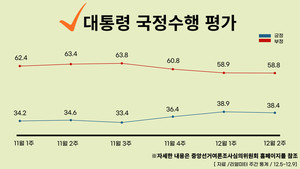 [뉴스포스트=강은지 기자] 여론조사업체 리얼미터가 지난 5일부터 9일까지(12월 2주차) 전국 만 18세 이상 남녀 2504명을 대상으로 윤 대통령의 국정 수행에 대해 평가한 결과 긍정이 38.4%, 부정이 58.8%로 조사됐다고 12일 밝혔다. 긍정 평가는 직전 조사인 12월 1주째 보다 0.5%포인트 감소했고, 부정 평가는 0.1%포인트 감소하면서 부정평가와 긍정평가의 차이는 20.4%포인트로 오차범위(95% 신뢰수준에서 ±2.0%포인트)를 기록했다.이번 조사는 무선(97%)·유선(3%) 자동응답(ARS) 방식으로 진행됐으며 응