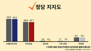 [뉴스포스트=강은지 기자] 여론조사업체 리얼미터가 지난 11월 28일부터 12월 2일까지 정당 지지도를 조사한 결과 더불어민주당 46.0%, 국민의힘 38.8%로 집계됐다고 5일 밝혔다. 정의당 3.4%, 기타 정당 1.7%, 무당층 10.1%이 뒤를 이었다. 더불어민주당은 전주보다 0.5%포인트 증가했고, 국민의힘은 2%포인트 증가했다.이번 조사는 무선(97%)·유선(3%) 자동응답(ARS) 방식으로 진행됐으며 응답률은 3.5%다. 표본오차는 95% 신뢰수준에 오차범위 ±2.0%p다.