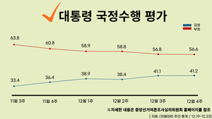 [뉴스포스트=강은지 기자] 여론조사업체 리얼미터가 지난 19일부터 23일까지(12월 4주차) 전국 만 18세 이상 남녀 2518명을 대상으로 윤 대통령 국정 수행과 관련해 조사한 결과 긍정이 41.2%, 부정이 56.6%로 조사됐다고 26일 발표했다.긍정 평가는 직전 조사인 12월 3주째 보다 0.1%포인트 증가했고, 부정 평가는 0.2%포인트 감소하면서 부정평가와 긍정평가의 차이는 15.4%포인트로 오차범위(95% 신뢰수준에서 ±2.0%포인트)를 기록했다.이번 조사는 무선(97%)·유선(3%) 자동응답(ARS) 방식으로 진행됐으며