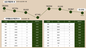 [뉴스포스트=강은지 기자] 22일 질병관리청에 따르면 이날 오전 0시 기준 국내 코로나19 일일 신규 확진 환자 수는 8만 1058명이다. 국내 발생 확진자는 8만 1043명, 해외 유입 확진자는 15명이다. 위중증 환자는 833명이다.지역별 신규 확진자 수는 ▲서울 13191명 ▲경기 20431명 ▲경남 4625명 ▲부산 3130명 ▲울산 1852명 ▲대구 4030명 ▲강원 3169명 ▲경북 5021명 ▲충북 3054명 ▲대전 2859명 ▲인천 4098명 ▲광주 2806명 ▲전남 3826명 ▲전북 3347명 ▲충남 3845명 ▲제