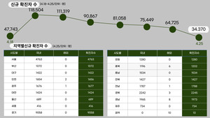 [뉴스포스트=강은지 기자] 25일 질병관리청에 따르면 이날 오전 0시 기준 국내 코로나19 일일 신규 확진 환자 수는 3만 4370명이다. 국내 발생 확진자는 3만 4339명, 해외 유입 확진자는 31명이다. 위중증 환자는 668명이다.지역별 신규 확진자 수는 ▲서울 4763명 ▲경기 9058명 ▲경남 1965명 ▲부산 1072명 ▲울산 689명 ▲대구 1422명 ▲강원 1280명 ▲경북 2242명 ▲충북 1196명 ▲대전 1424명 ▲인천 1654명 ▲광주 1676명 ▲전남 1787명 ▲전북 1427명 ▲충남 1534명 ▲제주 7