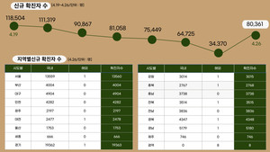 [뉴스포스트=강은지 기자] 26일 질병관리청에 따르면 이날 오전 0시 기준 국내 코로나19 일일 신규 확진 환자 수는 8만 361명이다. 국내 발생 확진자는 8만 345명, 해외 유입 확진자는 16명이다. 위중증 환자는 613명이다.지역별 신규 확진자 수는 ▲서울 13559명 ▲경기 19362명 ▲경남 5179명 ▲부산 4004명 ▲울산 1753명 ▲대구 4904명 ▲강원 3014명 ▲경북 4347명 ▲충북 2767명 ▲대전 2477명 ▲인천 4282명 ▲광주 2197명 ▲전남 3836명 ▲전북 3514명 ▲충남 3738명 ▲제주