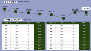 [뉴스포스트=강은지 기자] 27일 질병관리청에 따르면 이날 오전 0시 기준 국내 코로나19 일일 신규 확진 환자 수는 7만 6787명이다. 국내 발생 확진자는 7만 6750명, 해외 유입 확진자는 37명이다. 위중증 환자는 546명이다.지역별 신규 확진자 수는 ▲서울 11517명 ▲경기 18415명 ▲경남 4649명 ▲부산 3027명 ▲울산 1772명 ▲대구 3598명 ▲강원 2955명 ▲경북 5413명 ▲충북 2924명 ▲대전 2719명 ▲인천 3624명 ▲광주 3053명 ▲전남 3634명 ▲전북 3932명 ▲충남 3692명 ▲제
