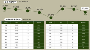 [뉴스포스트=강은지 기자] 28일 질병관리청에 따르면 이날 오전 0시 기준 국내 코로나19 일일 신규 확진 환자 수는 5만 7464명이다. 국내 발생 확진자는 5만 7443명, 해외 유입 확진자는 37명이다. 위중증 환자는 552명이다.지역별 신규 확진자 수는 ▲서울 9109명 ▲경기 13657명 ▲경남 3726명 ▲부산 2445명 ▲울산 1389명 ▲대구 2838명 ▲강원 2196명 ▲경북 3979명 ▲충북 2022명 ▲대전 1999명 ▲인천 2845명 ▲광주 2070명 ▲전남 2571명 ▲전북 2654명 ▲충남 2672명 ▲제주