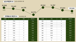 [뉴스포스트=강은지 기자] 29일 질병관리청에 따르면 이날 오전 0시 기준 국내 코로나19 일일 신규 확진 환자 수는 5만 568명이다. 국내 발생 확진자는 5만 538명, 해외 유입 확진자는 30명이다. 위중증 환자는 526명이다.지역별 신규 확진자 수는 ▲서울 7724명 ▲경기 12045명 ▲경남 3240명 ▲부산 2254명 ▲울산 1141명 ▲대구 2507명 ▲강원 1838명 ▲경북 3545명 ▲충북 1974명 ▲대전 1730명 ▲인천 2246명 ▲광주 1898명 ▲전남 2565명 ▲전북 2411명 ▲충남 2325명 ▲제주75