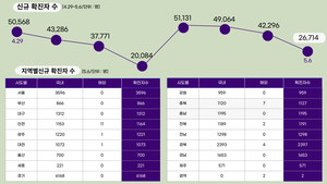 [뉴스포스트=강은지 기자] 6일 질병관리청에 따르면 이날 오전 0시 기준 국내 코로나19 일일 신규 확진 환자 수는 2만 6714명이다. 국내 발생 확진자는 2만 6686명, 해외 유입 확진자는 28명이다. 위중증 환자는 423명이다. 지역별 신규 확진자 수는 ▲서울 3596명 ▲경기 6168명 ▲경남 1653명 ▲부산 866명 ▲울산 700명 ▲대구 1312명 ▲강원 959명 ▲경북 2393명 ▲충북 1120명 ▲대전 1072명 ▲인천 1153명 ▲광주 1220명 ▲전남 1298명 ▲전북 1189명 ▲충남 1195명 ▲제주 571