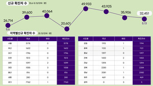 [뉴스포스트=강은지 기자] 13일 질병관리청에 따르면 이날 오전 0시 기준 국내 코로나19 일일 신규 확진 환자 수는 3만 2451명이다. 국내 발생 확진자는 3만 2436명, 해외 유입 확진자는 15명이다. 위중증 환자는 347명이다.지역별 신규 확진자 수는 ▲서울 5178명 ▲경기 7762명 ▲경남 2081명 ▲부산 1602명 ▲울산 816명 ▲대구 1796명 ▲강원 1193명 ▲경북 2283명 ▲충북 1120명 ▲대전 1055명 ▲인천 1513명 ▲광주 1097명 ▲전남 1394명 ▲전북 1400명 ▲충남 1397명 ▲제주 4