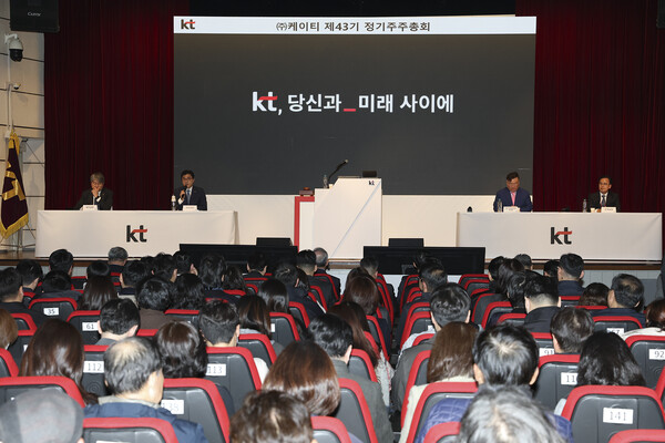 KT는 31일 오전 서울 서초구 KT 연구개발센터에서 주주총회를 개최했다. 이날 KT는 의안 보고와 투표를 진행했던 과거와 달리 사업 전략 발표와 질의응답 세션을 통해 주주들과 소통을 늘렸다.