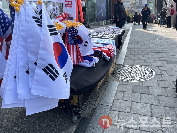 인도 쪽에 좌판을 열고 태극기 굿즈를 파는 어르신이 있었다. 그에게 탄핵심판 결과를 어떻게 예측하는지 묻자 "당연히 업무에 복귀하시겠죠!"라고 호탕하게 얘기했다.