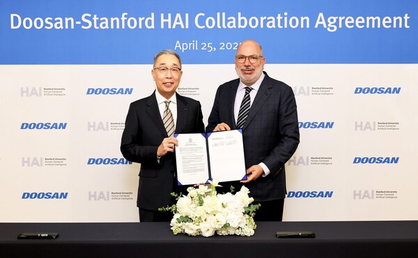 회사는 피지컬 AI 추진의 일환으로 최근 미국 스탠포드 대학의 Human-Centered AI 연구소(HAI)와 산학 협력 파트너십을 맺었다. 이 자리에는 박지원 두산그룹 부회장과 제임스 랜데이 HAI 공동연구소장 등이 참석했다.