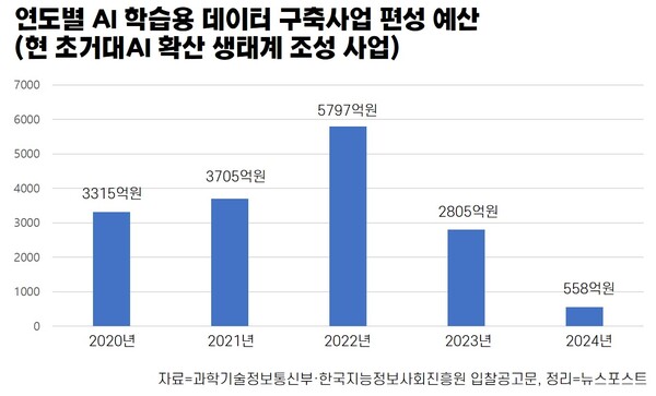 AI 정책 당국은 IT기업들의 비용 부담을 덜기 위해 2017년부터 AI 학습용 데이터를 구축해왔다. 2020년에는 예산을 대폭 확대했고, 2024년에는 사업명을 '초거대AI 확산 생태계 조성사업'으로 변경했다. 올해는 LG·SK·네이버·업스테이지·엔씨 등 '독자 AI 파운데이션 모델 프로젝트' 정예팀을 통한 데이터 구축에도 나선다. 이들이 구축한 데이터는 향후 AI허브에 적재된다.