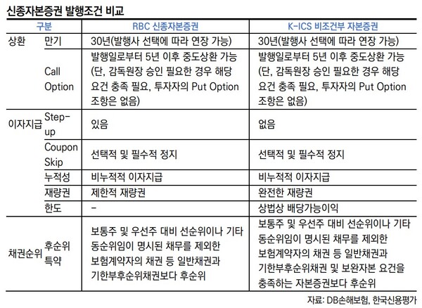 한편 금융당국은 2023년 7월 보험업법 개정으로 보험사의 기본자본 신종자본증권 발행을 허용했다. 다만 후순위채와 기존 신종자본증권 대비 이점이 크지 않은 데다, 조건도 까다로워 현재까지 발행한 보험사가 없었다. 업계에서 기본자본 신종자본증권을 발행하는 회사는 DB손보가 최초다.