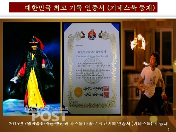 그가 불마술로 기네스북에 오른 건 2015년, 처음엔 가르쳐주는 사람이 없어 혼자서 연습하느라 많은 시행착오를 겪었다. 불마술 역시 방송극 측의 제안 때문이었다. “방송극 생일인데 케잌에 불을 붙이는 장면이 필요하다고. 입에서 최대한 불이 길게 나와야 한대요. 그 미션을 받고 그날부터 엄청 연습했어요. 하루에도 몇 시간씩 가스를 입에 머금고 내뿜는 연습을 했지요. 처음엔 부탄가스로 했어요. 그랬더니 불이 허옇게 나와 안 보이더라고요. 그래서 시너로 했지요. 그랬더니 순식간 불이 얼굴을 덮쳐 얼굴 전체가 홀랑 벗겨져 버렸어요. 다행히 겉 피부만 화상을 입어 흉터가 남지 않았는데 당시 몇 개월 동안을 화상치료를 받았어요. 가족들은 하지 말라며 난리였어요. 그렇지만 마술사 2만이 넘는 시대에 그들이 하지 않는 뭔가를 해야 살아남는 거라서 끝까지 강행했지요. 그때 마침 인천에 사는 칠용이 부자가 불을 잘 다룬다는 소리가 있어 찾아갔지요. 장애를 가진 분들인데 그 분들에게 1주일을 배웠어요. 그러니 제법 불을 다룰 수 있게 되더라고요. 불을 좀 다룰 수 있게 되자 춤을 가미한 3분짜리 안무를 했어요. 프로무용수로만 15년이라 제가 춤은 자신 있었거든요. 정말 폭발적인 반응이 왔어요. 그때부터 공연이 많아지면서 많은 사랑을 받게 되었어요. 세계적인 불의 귀인 세 사람(한국, 프랑스, 일본) 중의 한 사람으로 정상(기네스북)의 자리에 오르는 영광도 누리게 되었고요.”