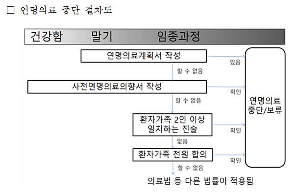또한 연명의료결정법에 따르면 내년 2월부터 담당의사와 해당분야 전문의 1명으로부터 임종과정에 있다는 의학적 판단을 받은 환자는 연명의료를 시행하지 않거나 중단하는 결정을 할 수 있다.