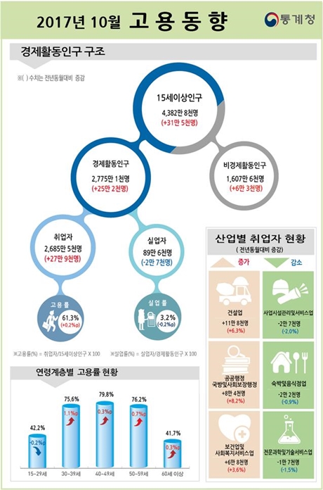 15일 통계청이 발표한 ‘10월 고용동향’에 따르면 10월 취업자 수는 2685만5000명으로 전년 동월 대비 0.1% 증가한 27만9000명을 기록했다.