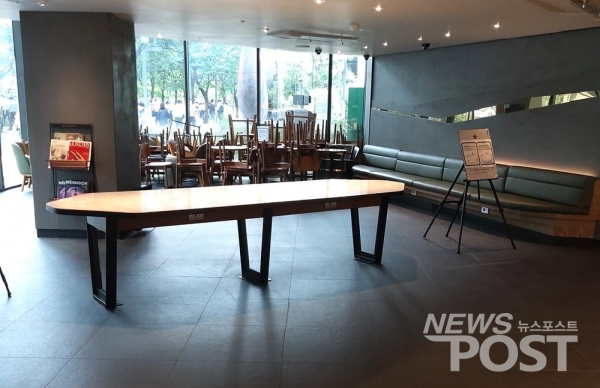 직장인 밀집 지역인 서울 여의도의 한 대형 커피 프랜차이즈도 내부 테이블은 모두 치운 상태로 테이크 아웃 고객만 받고 있었다. 테이블과 의자를 매장 구석으로 치워놓고 음료 주문 시 사회적 거리두기를 지킬 수 있기 테이핑을 해놨다.