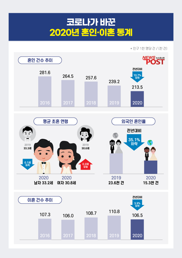 한편, 지난해 혼인 건수는 1970년 혼인통계 작성 이후 가장 적은 수치를 기록했다. 혼인건수는 21만 4,000건으로 전년대비 2만 6,000건이 줄어 10.7%가 감소했다. 외국인과의 혼인은 1만 5,000건으로 전년보다 8,000건이 줄어든 35.1%를 기록했다. 통계청은 외국인 입국이 급감하면서 국제결혼이 크게 감소했다고 분석했다.