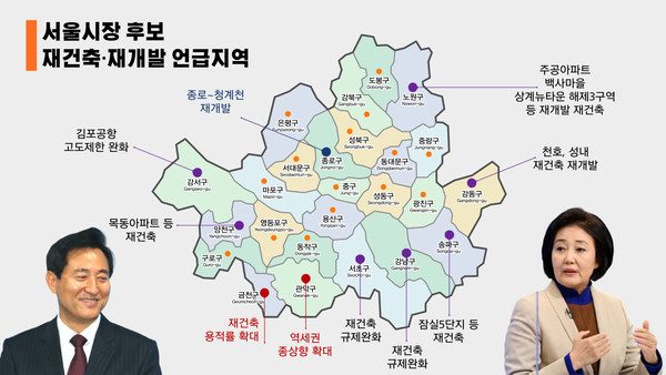 재건축·재개발 공약은 박영선 후보와 오세훈 후보 모두 적극적으로 추진하겠다고 약속했다. 박 후보는 공공과 민간이 함께하는 재건축·재개발에, 오 후보는 민간이 주도하는 재건축·재개발에 방점을 찍었다.