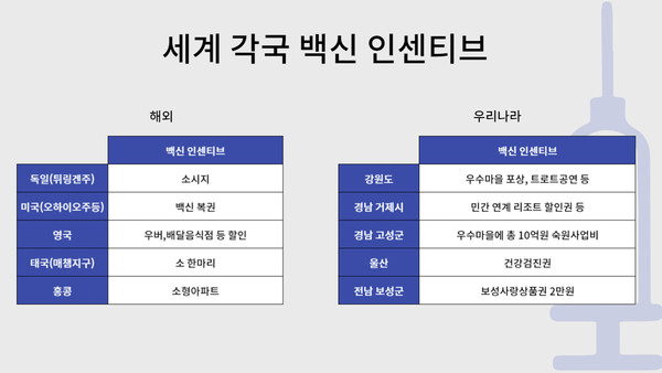 우리나라에서도 각 지자체에서 백신 인센티브를 걸며 접종률 올리기에 동참하고 있다. 울산에서는 백신 접종을 완료한 시민을 대상으로 추첨을 통해 ‘건강검진권’을 제공하기로 했다.