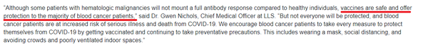 해외 주요 단체들은 오히려 백혈병 환자에게 백신 접종을 권고하고 있었다. 백혈병 및 림프종 학회(Leukemia & Lymphoma Society) 보고서에는 “일부 백혈병 환자는 건강한 사람에 비해 완전한 항체 반응을 나타내지 않지만, 백신은 안전하며 대다수 혈액암 환자에게 보호 기능을 제공한다”고 적혀있다.