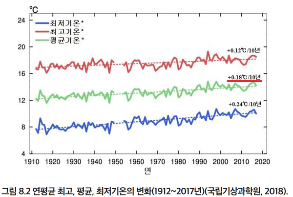 한편, 우리나라 평균기온은 106년간(1912~2017년) 약 1.8℃ 상승했다. 전세계 평균기온 상승의 약 2.1배인 것이다. 환경부와 기상청이 작년 7월 발간한 ‘한국 기후변화 평가보고서 2020’에 따른 결과다. 보고서는 “106년(1912년~2017년) 동안 우리나라의 연평균기온은 13.2°C로 10년마다 약 0.18°C씩 상승했다”며 “최근 30년 기온은 과거30년(1912년~1941년)에 비해서 1.4°C가 더 증가했다”고 전했다. 이어 “온실가스 감축 노력에 따라 21세기 말 2.9℃에서 4.7℃까지 상승할 수 있다”고 밝혔다.