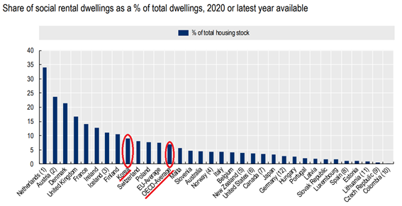 전혀 사실 아님. 공공임대주택 비중이 20%가 넘는 국가는 세 나라에 불과했고 선진국이라 불리는 G7에선 20%가 넘는 나라가 없었다. 우리나라는 8.9%였다. 최근 몇 년 동안 공공임대주택이 증가해 OECD 평균을 넘은 것으로 보인다. 하지만 각 나라마다 주택 상황이 달라 단순 수치가 이야기해주지 않는 것도 있었다. 공공임대주택 비중이 높은 국가들은 중앙정부가 아닌 비영리단체에서 공급을 담당했고, 민간임대주택 비중이 높은 독일은 정부의 규제로 일부 공공성을 띠었다.