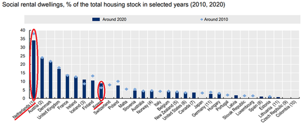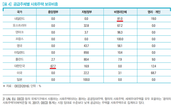 주택금융연구원 보고서 '유럽국가의 사회주택 현황과 지원정책에 관한 사례연구'에 따르면, 네덜란드, 오스트리아, 덴마크의 중앙정부 공급 비중은 0이다. 대신 네덜란드는 비영리단체가 사회주택의 81%를 보유하고 있었고, 오스트리아는 지방정부가 32%, 비영리단체가 67.2%를 공급하고 있었다. 한편 우리나라는 중앙정부가 67% 이상 사회주택을 공급했다.