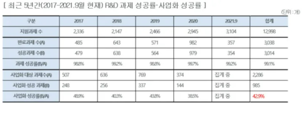 지난 10월 김경만 더불어민주당 국회의원이 한국산업기술평가관리원으로부터 제출받은 국정감사 자료에 따르면, 최근 5년간 R&D 과제 성공률은 모두 98%를 넘었다. 지난해는 99.7%를 기록하기도 했다. 982개의 완료 과제 중 979개를 성공한 것이다. 지원과제 수도 2017년 2336개에서 2021년 3104개로 매년 늘었다.