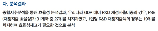 2018년 국회예산정책처가 발간한 ‘NABO 산업동향 & 이슈 (제7호)’에 따르면 국가 R&D 사업의 효율성을 나타내는 재정지출효율성(PSE) 종합 지수는 OECD 31개국 중 27위였다. 올해 8월 나온 한국과학기술기획평가원(KISTEP)의 ‘2020년 국가 과학기술혁신역량 분석’에서는 과기혁신역량지수(COSTII) 성과 부문이 OECD 35개국 중 14위에 불과했다.