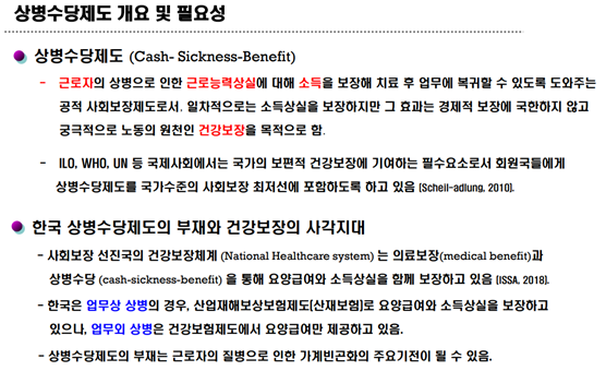 한국보건사회연구원 보고서는 “근로자가 아프면 휴식을 취하고 적절한 치료를 받고 직장으로 복귀하는 너무나 당연한 사실이 아이러니하게도 이제야 당연한 절차와 권리로 인식되고 있다”면서 “아파서 일하기 힘들 때 충분한 휴식과 회복의 시간을 가지기 위해서는 소득 활동이 중단된 기간에도 소득단절이 발생해서는 안 된다”고 전했다.