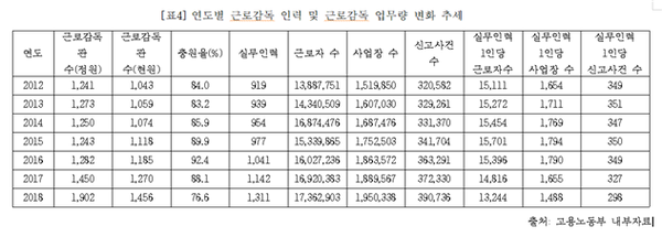 실제로 여러 보고서에서 근로감독관의 업무 부담을 지적하고 있었다. 다른 선진국에 비해 근로감독관 수가 크게 모자르지 않다고 발표한 한국노동연구원 보고서조차 “근로감독관들은 주당 13시간 이상 초과근무를 할 정도로 업무량이 매우 많다”며 “현재 인력은 업무량에 비해 상당히 부족한 것으로 인식되어 현원 대비 40~45% 정도의 충원이 이루어질 필요성이 있는 것으로 나타난다”고 밝혔다.