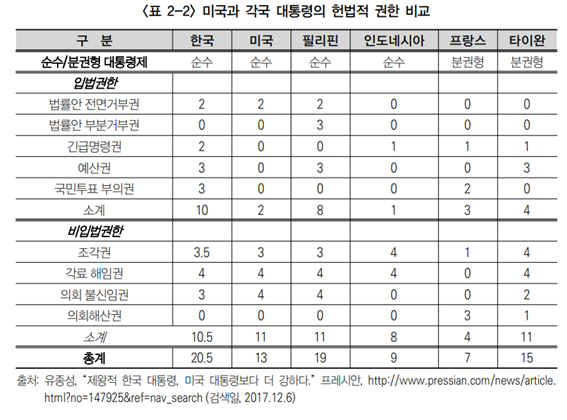 전문가들의 의견을 종합해 보면, 우리나라의 대통령제가 미국보다 강하다는 평이 다수였다. 한국행정연구원 보고서에 따르면, 대통령의 헌법적 권한에 점수를 매겼을 때 우리나라는 20.5점, 미국은 13점을 받았다. 조각권, 의회불신임권 등 비입법권한에서는 미국에 뒤졌지만, 긴급명령권, 예산권, 국민투표 부의권 등 입법권한에서 미국의 5배에 달하는 점수를 기록했다.