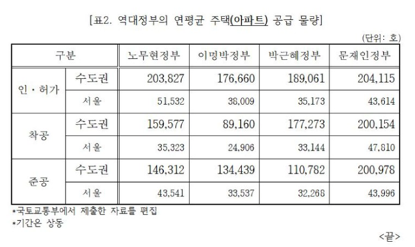 하지만 주택 전체로 범위를 넓히면 역대 최대가 아니다. 현 정부의 수도권 주택 공급량은 28만1천호로 두 번째다. 박근혜정부가 29만6천호로 가장 많은 주택을 공급했다. 이명박정부가 24만8천호, 노무현정부가 23만5천호를 공급했다.