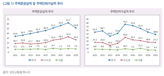 국토연구원 보고서도 수도권 주택 공급 자체는 감소 추세라고 설명했다. 국토연구원에서 2020년 발간한 '수도권 중장기 주택공급 전망과 시사점'에 따르면 수도권 주택 공급은 2018년 32만9천호를 정점으로 2019년 26만5천호로 감소했고, 2020년 누계 기준 전년 동기 대비 9.1% 감소했다.