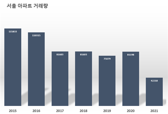 실제 서울 아파트 거래량은 2017년도를 기점으로 눈에 띄게 줄었다. 문재인 정부가 양도세 규정을 강화하던 시점이다. 2017년 8·2 대책에서는 다주택자의 조정대상지역 양도세를 20%포인트 중과하고 조정대상지역 내 1주택자의 비과세 요건에 2년 거주를 추가했다. 이후로도 양도세 공제 요건을 여러 차례 바꾸다가, 지난해 7·10 대책에서는 다주택자 양도세 중과세율을 30%로 높였다. 그러면서 2015~2016년도에 매년 10만 건이 넘어가던 서울 아파트 거래량은 2017년도를 기점으로 8만 건으로 줄어들었고, 지난해는 4만 2218건으로 반토막이 났다.