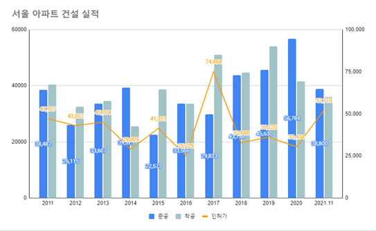 다만, 서울 아파트 공급이 현 정부에서 특별히 줄었다고 보기에는 어렵다. 지난 10년(2011년~2021년)간 국토교통부 주택건설실적통계에 따르면, 서울 아파트는 준공과 착공, 인허가 실적 모두 2017년을 기점으로 과거보다 늘었다.