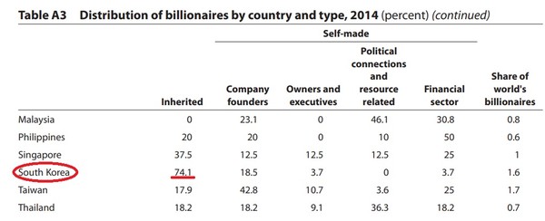 기업 평가기관 CEO스코어는 2017년 주요 4개국 각 40명의 주식 부자를 분석한 결과, 상속형 부자 비율이 한국 62.5%, 미국 25%, 일본 30%, 중국 2.5%라고 발표했다. 우리나라가 압도적 1등이었다. 즉, 시간이 지나면서 비중이 줄고는 있지만 여전히 상속형 부자는 다른 나라에 비해 높은 상태였다.