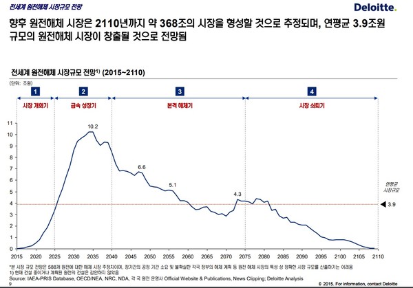 따라서 원전 해체는 2030년 이후에 본격적으로 이루어질 전망이다. 딜로이트는 2015~2029년을 개화기, 2030~2049년을 성장기, 2050년 이후를 성숙기로 분류했다. 성장기와 성숙기에 해당하는 기간이 전체 시장 규모의 약 83%를 차지한다.
