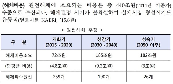 우선, 2011년이 아닌 2110년이었다. 딜로이트컨설팅과 한국원자력연구원이 2015년 공개한 ‘원전해체시장의 현황과 전망’에 따르면, 원전 해체 시장 규모는 2110년까지 368~440조로 예측됐다. 정부 역시 2019년, 시장 규모를 2100년까지 549조원으로 전망했다.