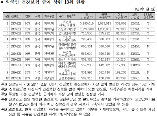 윤 후보는 “외국인 건보 급여지급 상위 10명 중 8명이 중국인”이라며 “가장 많은 혜택을 누린 중국인은 피부양자 자격으로 약 33억 원의 건보급여를 받았으나 약 10%만 본인이 부담했다”고 말했다.