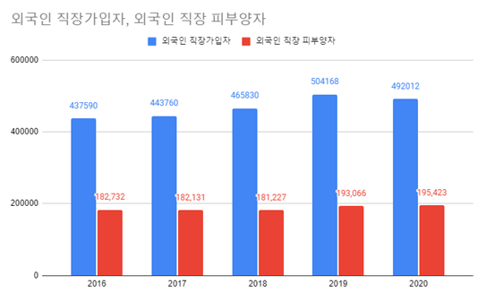 그런데 건강보험 피부양자 등록의 경우, 직장가입자의 피부양자는 국내에서 거주한 기간과는 관계없이 소득·재산 요건이 일정 수준 이하면 피부양자로 등록할 수 있다. 지역가입자와 달리 거주기간 제한이 없다보니, 코로나19 이후로 외국인 건강보험 직장 가입자가 줄어드는 상황에서도 외국인 건강보험 직장가입자의 피부양자는 오히려 늘어나는 현상까지 생겼다.