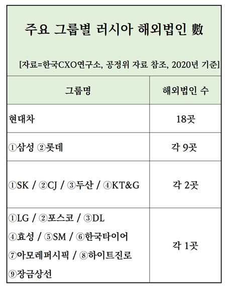 국내 그룹 가운데는 현대차 그룹이 53개 러시아 법인 가운데 18곳(34%)을 차지해 가장 많았다. 현대차 그룹은 현대차와 기아, 현대제철, 현대건설, 현대글로비스, 현대엔지니어링 등 계열사들이 러시아 법인을 운영 중이다.