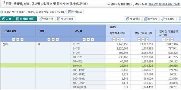 하지만 실제 통계를 보면 이는 상용근로자만을 합산한 결과다. 국가통계포털 KOSIS에 따르면, 50인 미만 사업장 상용근로자 수는 770만명이다. 10~29인 사업장 근로자 수가 288만으로 가장 많았고, 5~9인 사업장 근로자 수가 208만으로 2위였다. 소규모로 분류되는 50인 미만 사업장 근로자 수가 전체 상용근로자(1331만)의 57%였다.