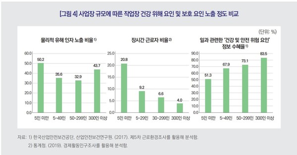 전문가들은 소규모 사업장일수록 처우 개선에 힘써야 한다고 지적했다. 지난해 발간된 한국보건사회연구원 ‘고용 형태 및 사업체 규모에 따른 노동자 건강불평등의 현황과 정책과제’에 따르면, 물리적 유해 인자 노출 비율은 5인 미만 사업장에서 가장 높았고, 주 52시간 초과 장시간 근로자 비율 역시 5인 미만 사업장에서 가장 높았다. 특히 장시간 근로자 비율은 사업장 규모가 커질수록 줄어들었다.